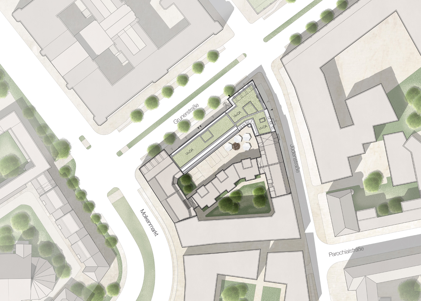 Drei großstädtische Gebäude bilden ein Ensemble, das sich gestalterisch an der Berliner Bautradition orientiert und zugleich eine zeitgenössische Architektursprache spricht. Die Fassaden reagieren jeweils auf Lage und Nutzung, variieren typologisch und folgen dennoch einer gemeinsamen Dreigliederung, die das Ensemble architektonisch zusammenbindet.