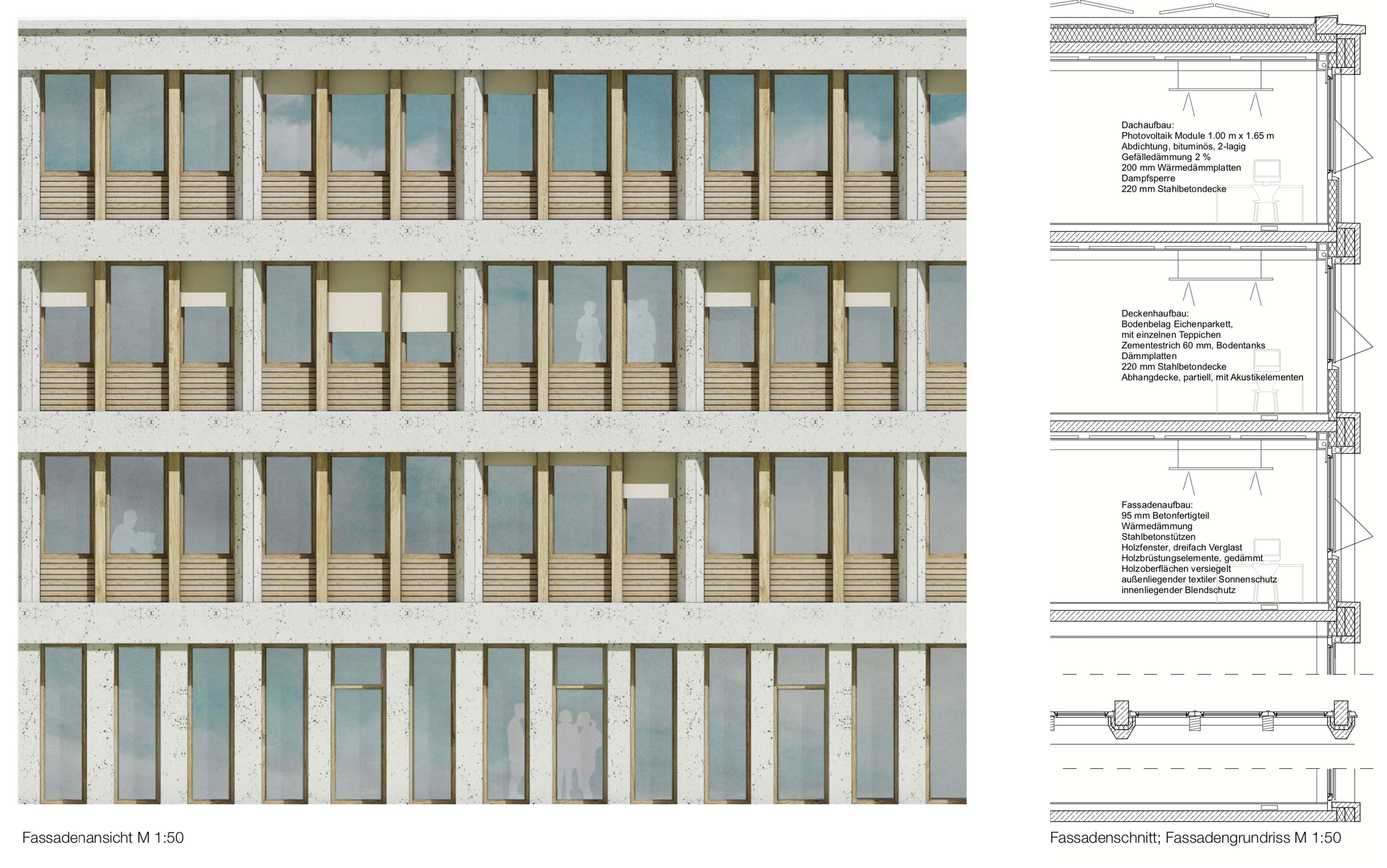 Das neue Landratsamt Fürth wird mit dem Bestand zu einem Ensemble. Es platziert sich angemessen gegenüber dem angrenzenden Wohngebiet. Der leicht zurückgesetzte Kopf des Büroriegels bildet einen markanten Auftakt zum Michael-Hösch-Platz. Die horizontal strukturierte Betonfassade mit vertikalen Stützen und Holzfensterelementen verleiht dem Haus Wertigkeit und ist zudem Garant für eine langlebige und alterungsfähige Gebäudehülle. Eingangsarchitektur und Saal heben sich dabei gestalterisch bewusst durch leichte Variationen der Tektonik von der Fassade des Büroriegels ab.