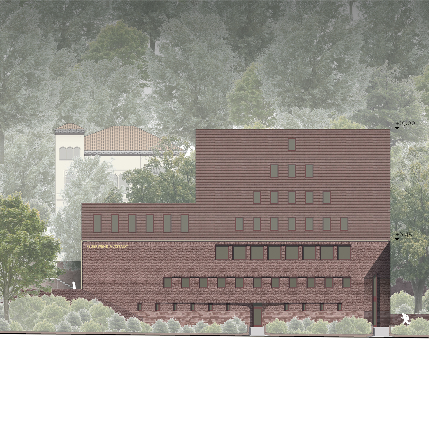 Die neue Feuerwehr fügt sich sensibel in das herausragende Altstadt-Ensemble ein, indem das Gebäude einen steinernen, monolithischen Charakter erhält und Materialien der Altstadt wie Neckartäler Sandstein für den Sockelbereich und Ziegel aufgenommen werden. Mit seinen prägnanten Satteldächern hebt sich die Feuerwehr jedoch selbstbewusst von der umliegenden Wohnbebauung ab und verdeutlicht damit seine Funktion als wichtiges öffentliches Gebäude der Stadt. Das große Satteldach tritt in Dialog mit anderen öffentlichen Gebäuden wie der Peterskirche oder der Heuscheuer aus dem 18. Jh. und spiegelt die Bedeutung der Feuerwehr als Ausbildungsstätte mit einem großen Schulungsraum als „Haus im Haus“ wider.
