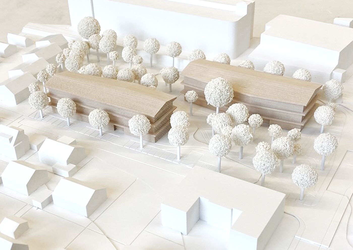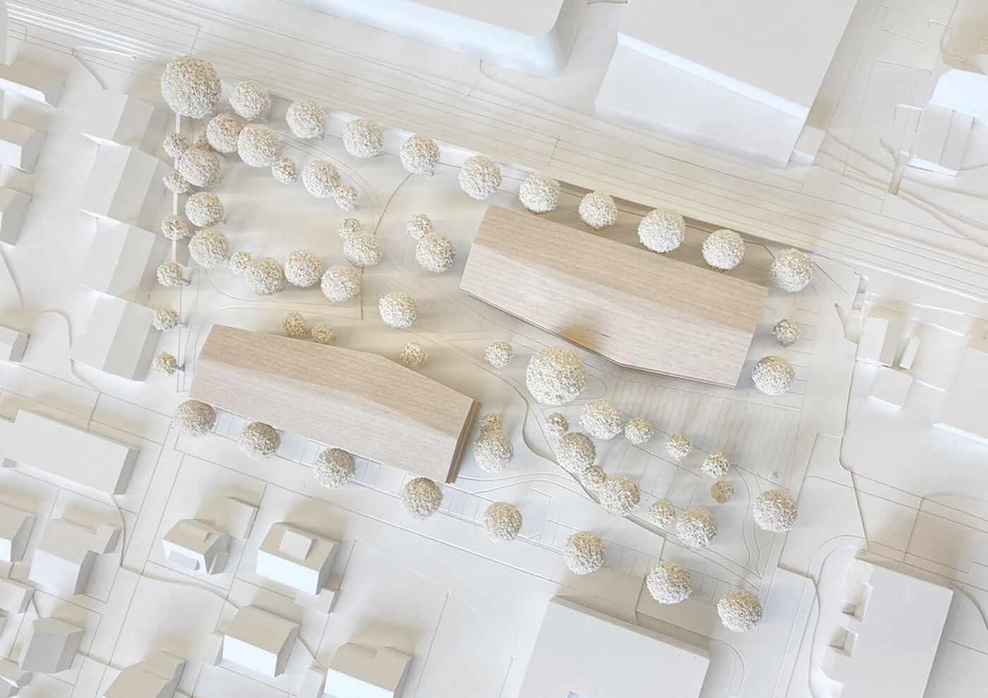 Zwei Häuser, das Mehrgenerationenhaus als offenes Haus und die Kindertagesstätte als schützende Behausung, stehen innerhalb des Bürgerparks in Beziehung zueinander und spannen einen städtebaulichen Raum auf. Das Gesamtensemble wird zum zentralen öffentlichen Ort der Begegnung und ist zugleich ein räumliches Gelenk, das von der Ortsmitte zum Quartier Mühlkanal überleitet und die beiden getrennten Bereiche Bürgerpark und Schachenmayr-Areal als Bindeglied zusammenführt.