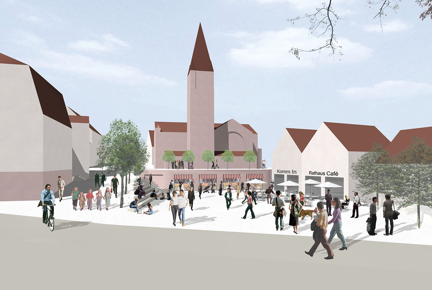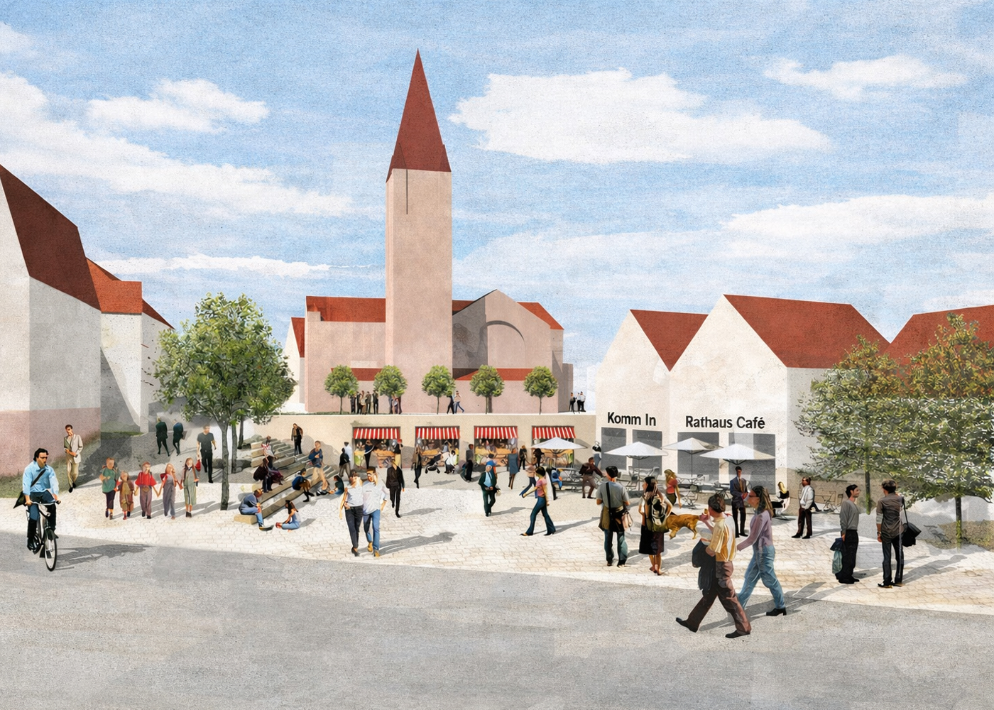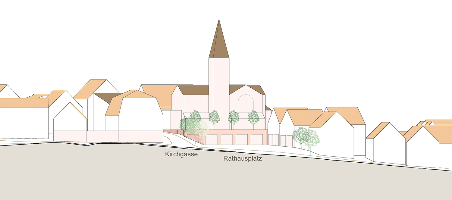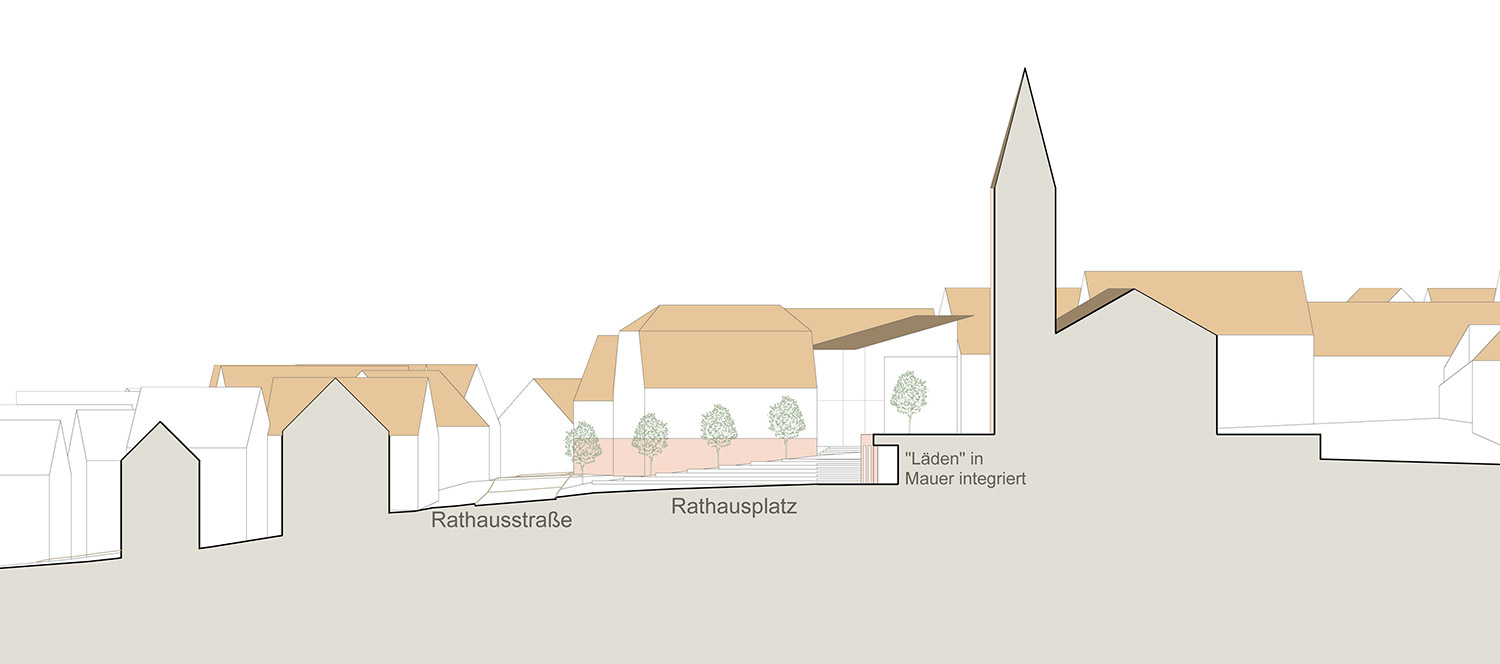 Der neue Rathausplatz schafft den erlebbaren Ortskern von Wimsheim. Am Platz befinden sich alle wichtigen identitätsstiftenden Gebäude wie Rathaus, Kirche, Diakonie, Bibliothek etc. Aus den bestehenden und neuen Gebäuden entsteht ein gestalterisches und funktionales Ensemble. Zusätzlich zu den öffentlichen Gebäuden wird er durch die im „Kirchenpostament“ befindlichen „Läden“, die je nach Bedarf Marktstände, kleine Verkaufsflächen oder Gastronomie beherbergen können, belebt. Auch die tribünenartige Treppe prägt als Gestaltungselement den individuellen Charakter des Platzes.