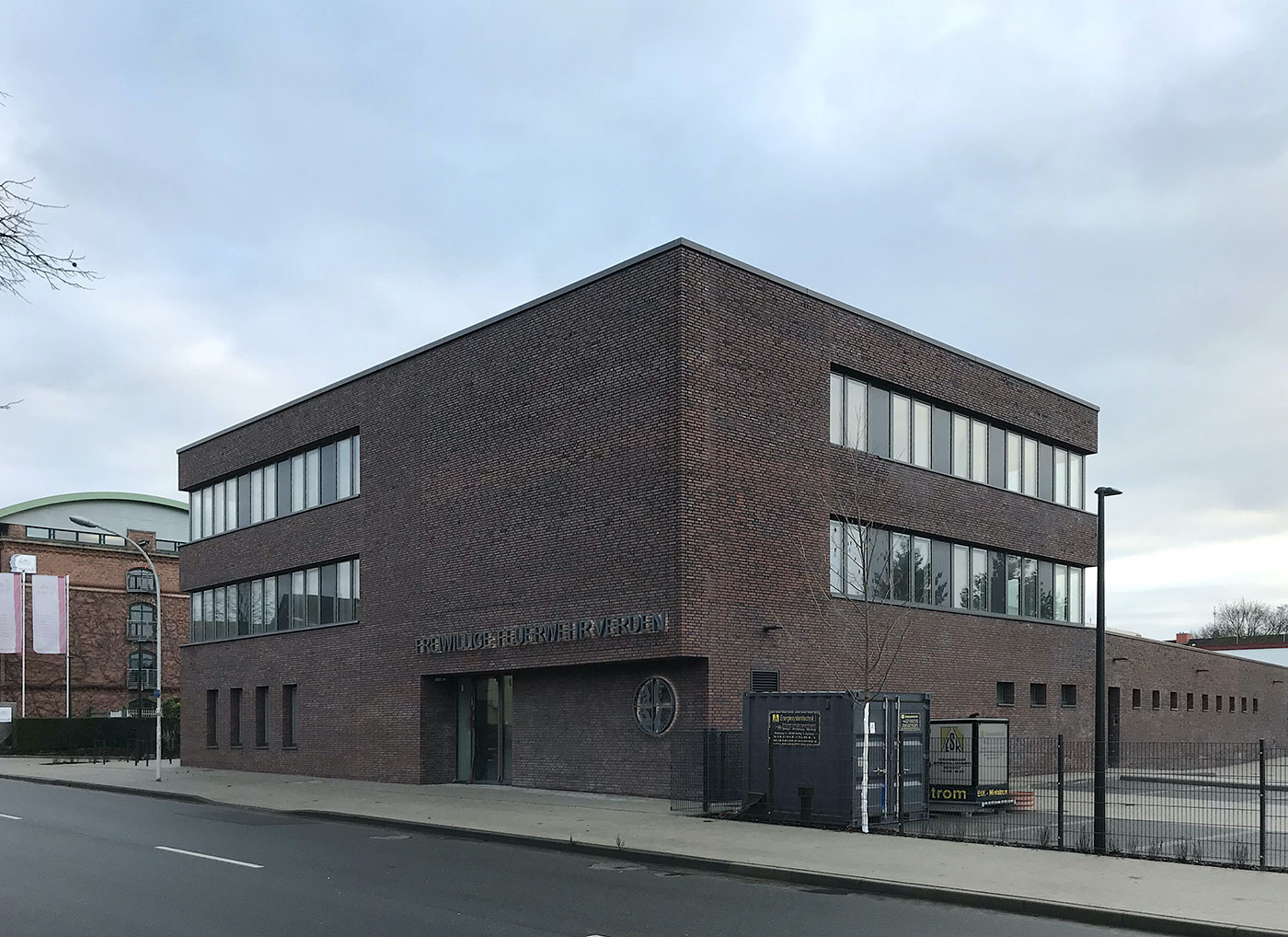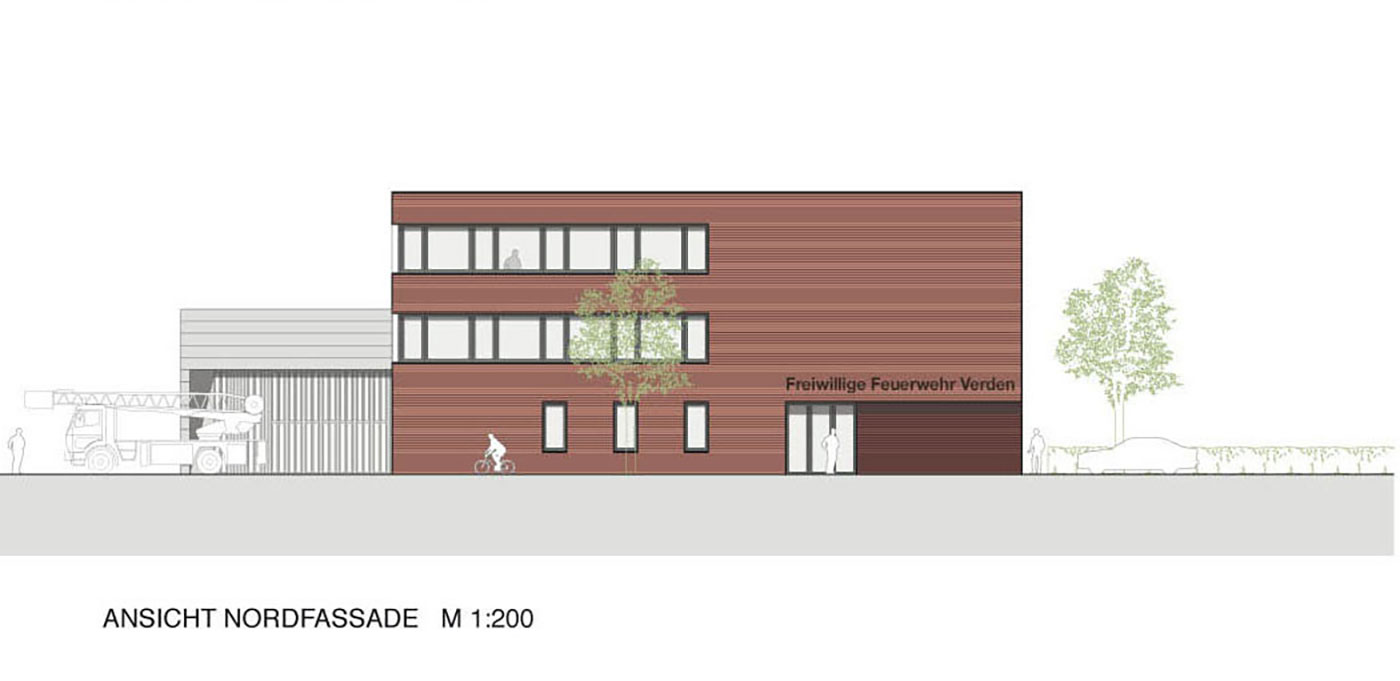 Der Baukörper gliedert sich in einen Kopfbau an der Lindhooper Straße und einen sich anschließenden, leicht abknickenden Hallenbau mit Nebengebäude. Die Verschneidung der Baukörper artikuliert sich als architektonisches Gelenk und öffnet die Fahrzeughalle funktional und visuell zur Straße. Eine auf wenige Themen begrenzte, zurückhaltende Architektursprache unterstützt die räumlichen und funktionalen Absichten. Die Gebäudeform unterstützt dabei direkte, optimal verknüpfte Alarmwege und schafft Funktionsbereiche, die nach ihren jeweiligen Anforderungen optimal positioniert sind.