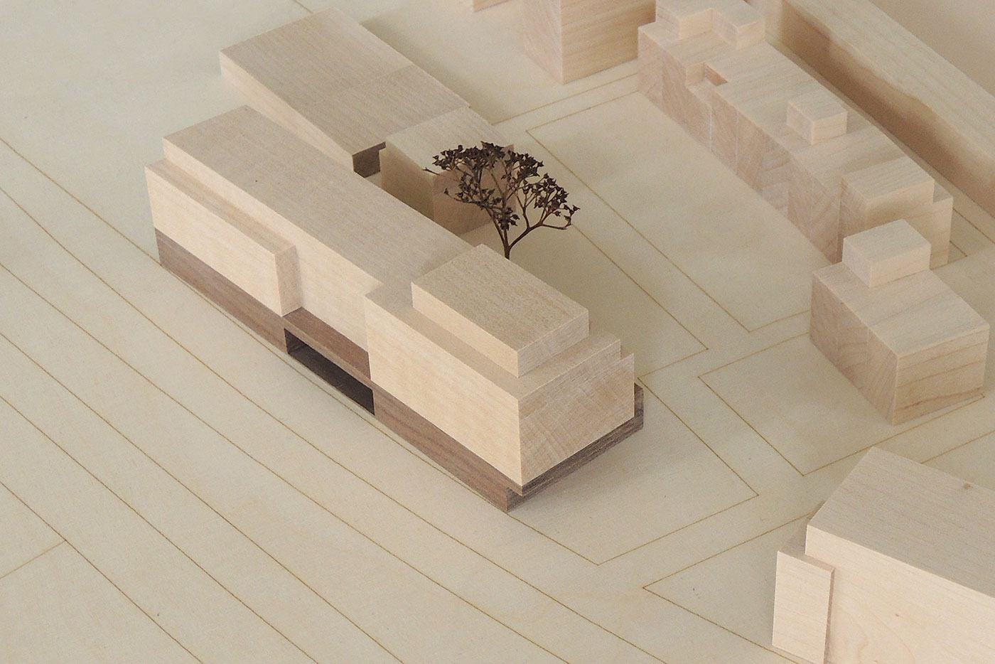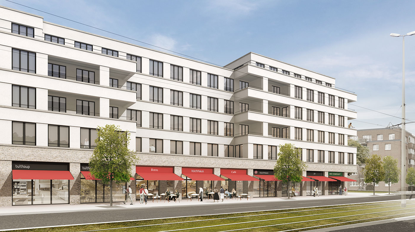 Das neue Wohn- und Geschäftshaus artikuliert sich als markanter straßenbegleitender Baukörper. Der Entwurf reagiert auf die übergeordnete Rahmenplanung der Stadt Braunschweig indem er den Blockrand in diesem Bereich wiederherstellt. Zudem fügt er sich mit großem Selbstverständnis in die Nachbarbebauung ein. Die Straßenfassade wird durch eine plastische Staffelung mit durchlaufendem Sockel und asymmetrisch angeordneten, unterschiedlich hohen Risaliten gegliedert. Hierdurch entsteht eine spannungsvolle und dynamische Raumfigur, die zu der Nachbarbebauung überleitet.