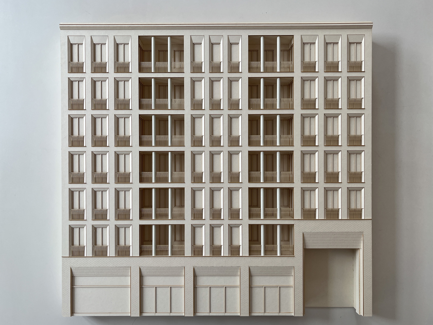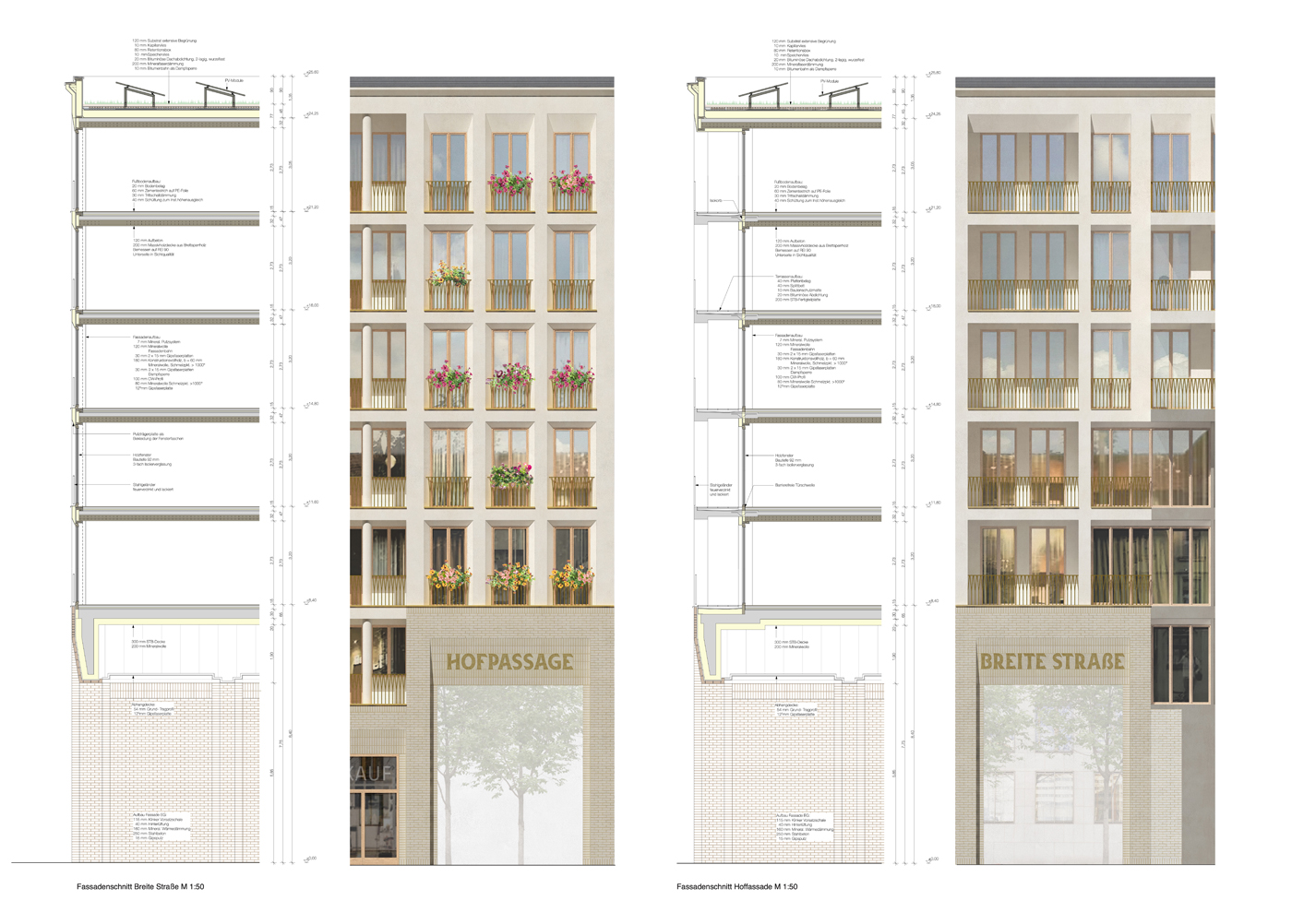 Das Torhaus wird als Teil der neuen Blockrandbebauung an der Breiten Straße als städtisches Wohnhaus mit repräsentativer Straßenfassade und informeller Hoffassade geplant. Der Fassadenentwurf basiert auf dem Berliner kaiserzeitlichen Wohnhaus mit dem klassischen Aufbau aus überhöhtem Erdgeschoss, plastisch ausgearbeitetem Mittelteil und oberem Abschluss durch Ausbildung einer Dachkante mit Attika. Im Gegensatz zu der Putzfassade der Obergeschosse wird die Besonderheit des Erdgeschosses durch geschlämmten Klinker hervorgehoben. Um das Gebäudevolumen in die Maßstäblichkeit typischer Berliner Stadthäuser zu übertragen, werden altbekannte Elemente städtischer Häuser integriert und neu interpretiert.