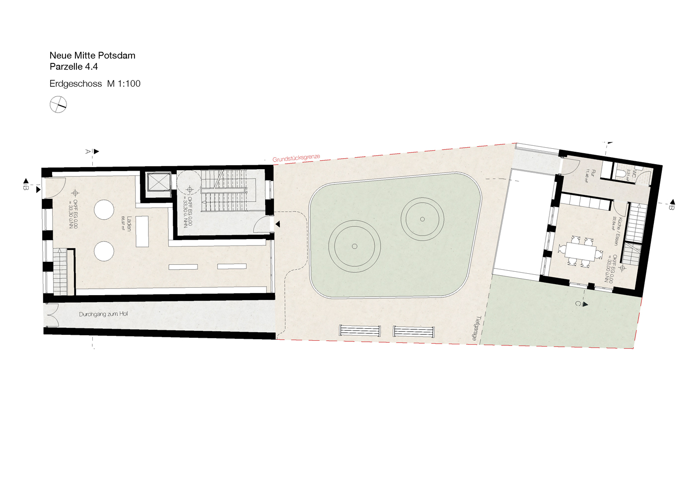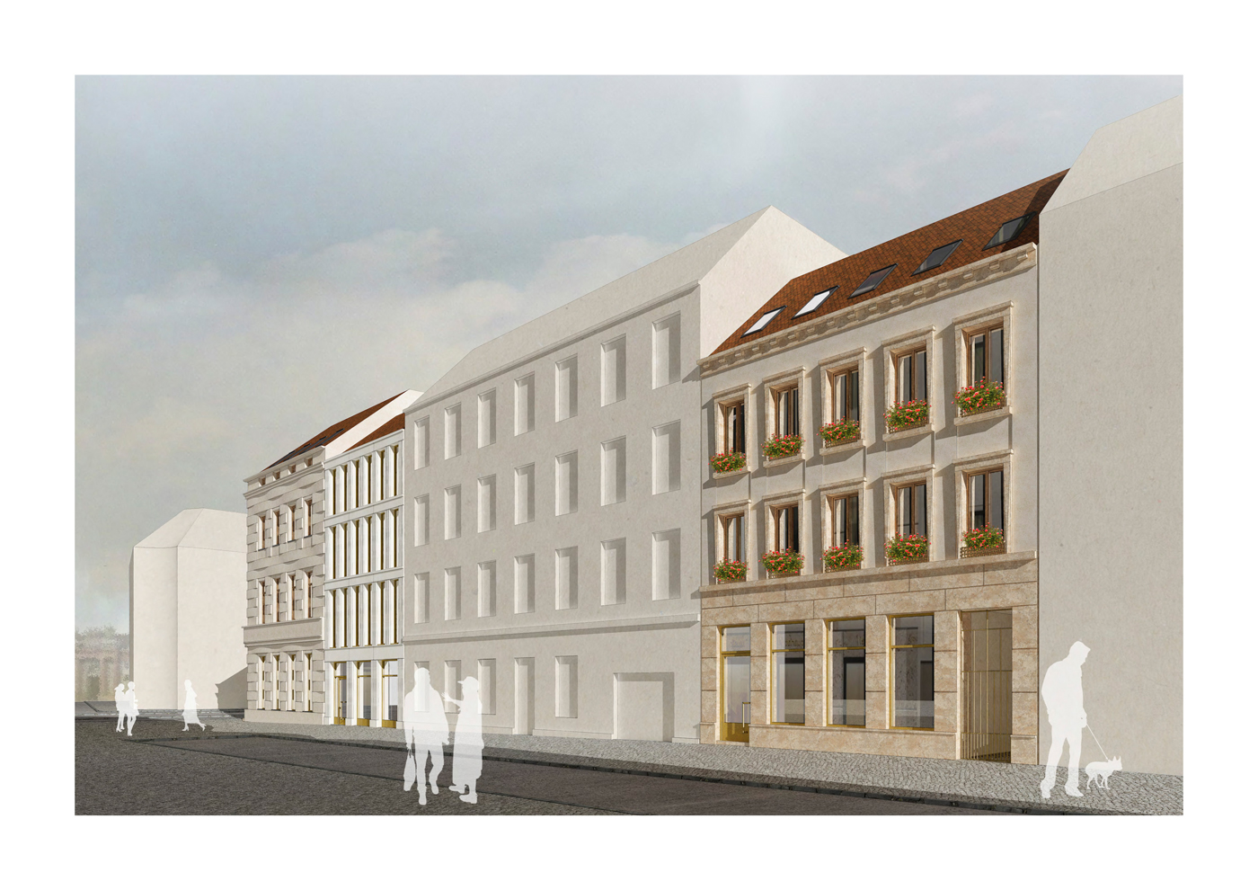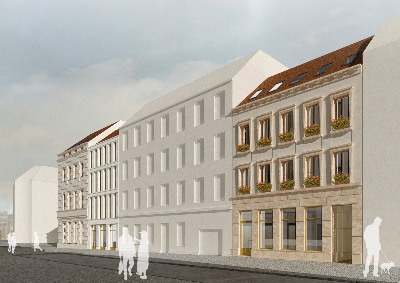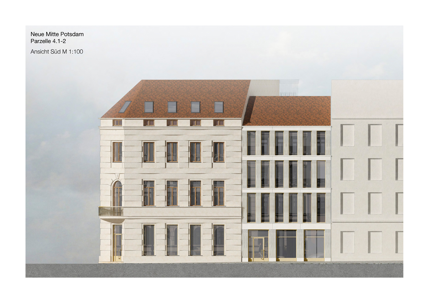 Größe gesamt: Eckhaus 1.685 m² BGF, Fugenhaus 444 m² BGF, 5-Achsen-Haus mit Remise 892 m² BGF