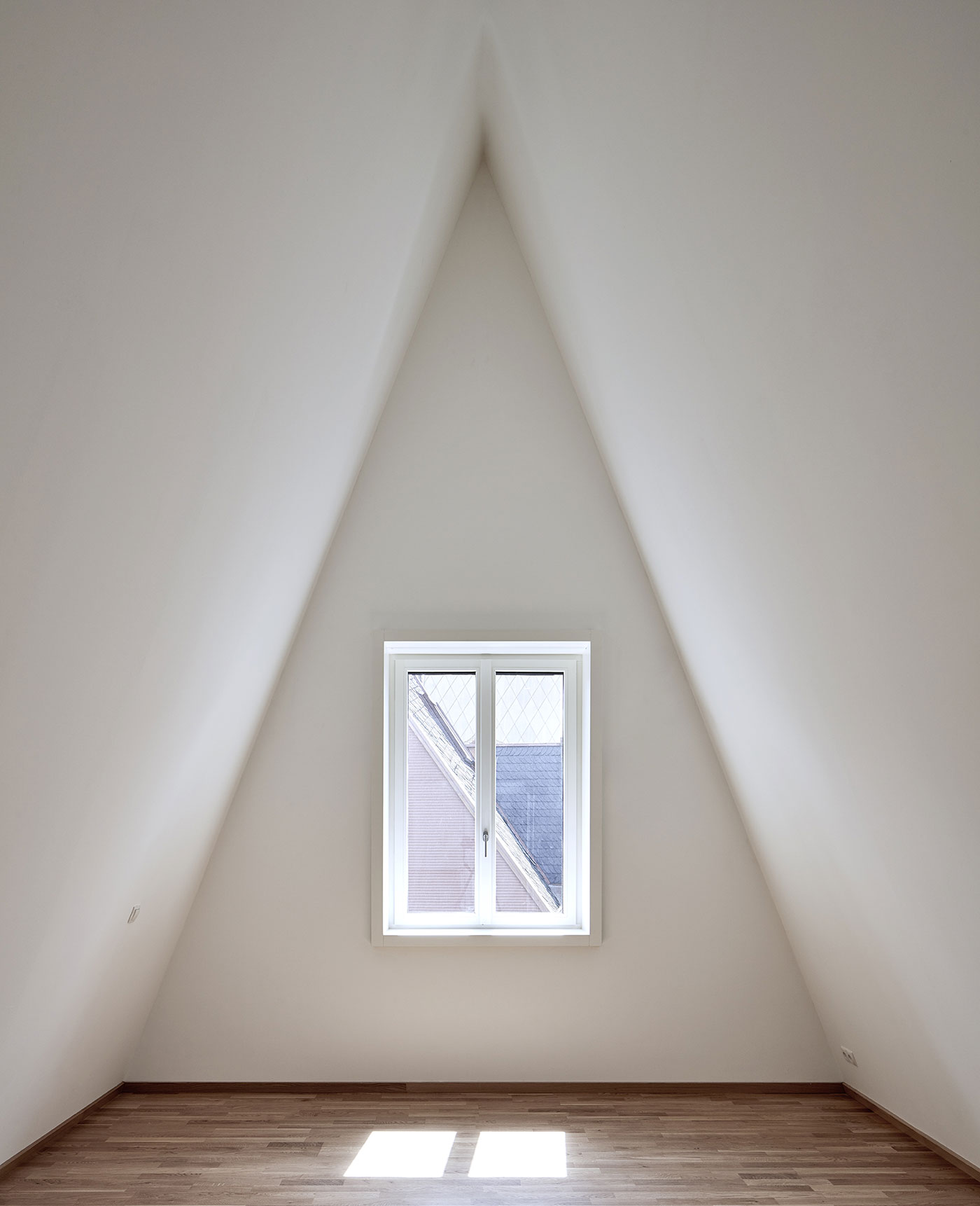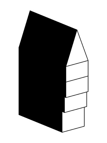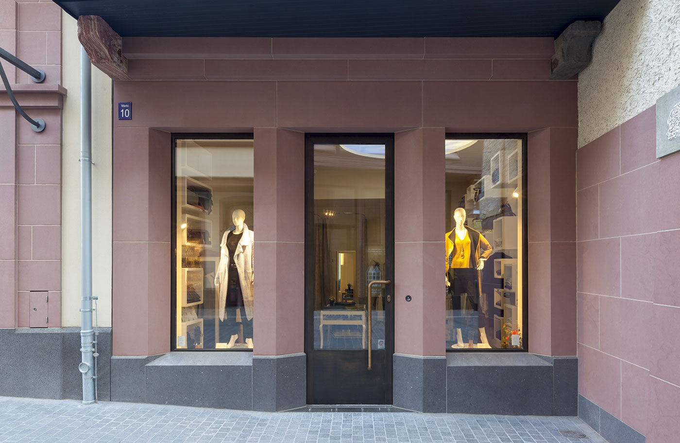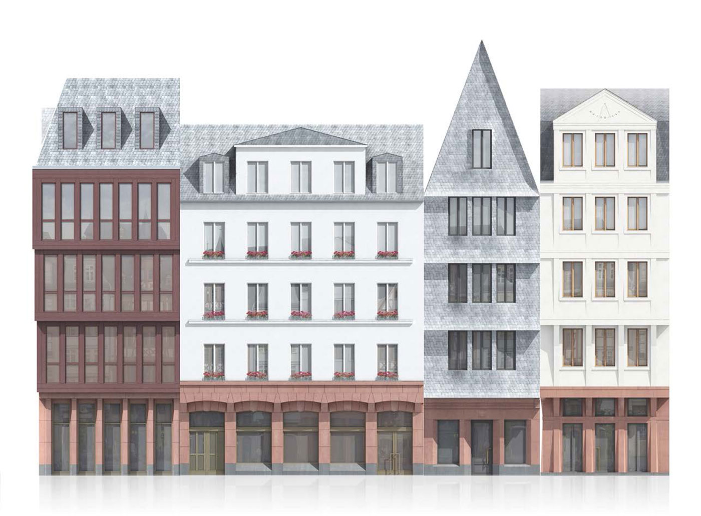 Ziel des Dom-Römer-Projekts war es auf historischer Parzelle durch zeitgenössische Neubauten ein ganzes Altstadtviertel wiedererstehen zu lassen. Das nur gut fünf Meter breite Haus füllt die Leerstelle eines einstigen Fachwerkbaus. Die Schieferfassade mit Spitzgiebel, vorspringende Geschosse und der rote Mainsandstein des Gebäudesockels sind Reminiszenzen an den historischen Vorgänger. Durch das Zusammenspiel von plastischer Form und Schieferschindeln gewinnt die Fassade zur Straße an besonderer Qualität und erinnert an ein eng anliegendes Paillettenkleid. Das Haus ist als Wohn- und Geschäftsgebäude konzipiert. Im Erdgeschoss ist die gewerbliche Nutzung angeordnet. Die Wohneinheit bietet im 1. OG einen repräsentativen Wohn- und Essbereich, im 2. OG intimere Wohnräume inkl. Gästezimmer sowie im 3. OG und im Dachgeschoss weitere Wohn- bzw. Schlafzimmer.
