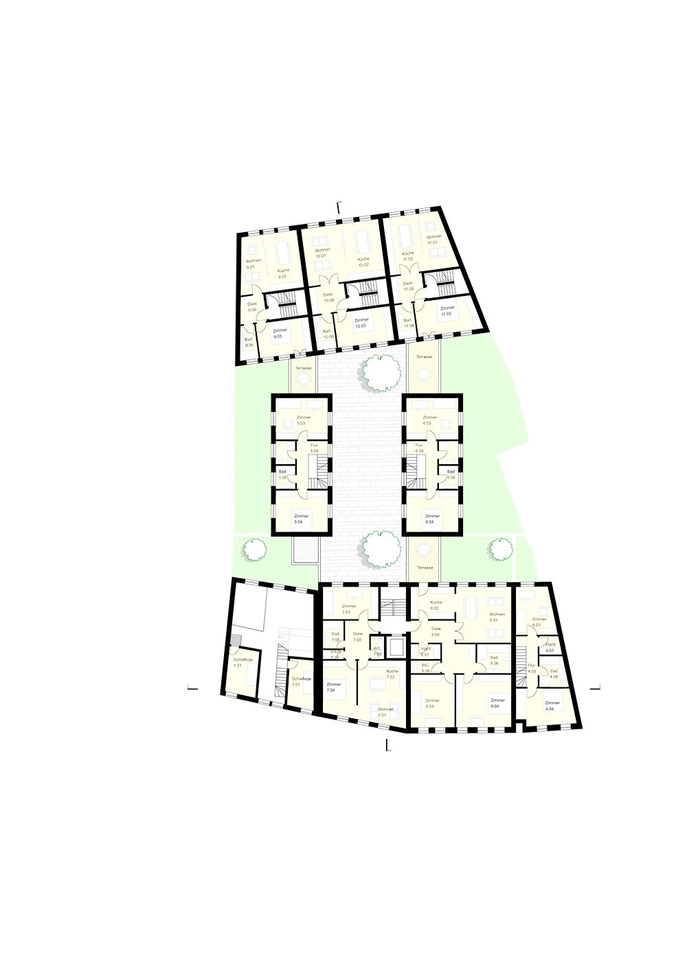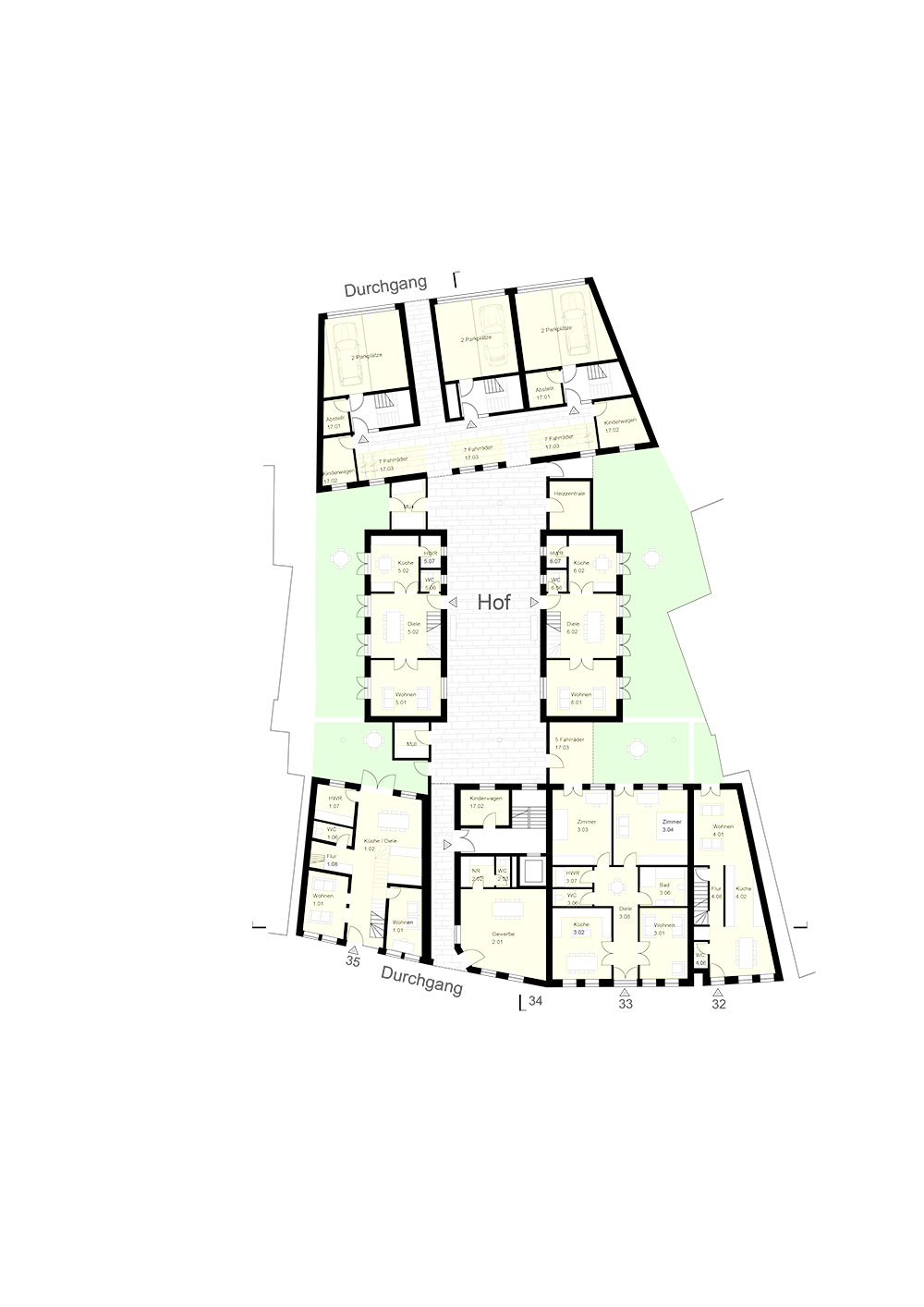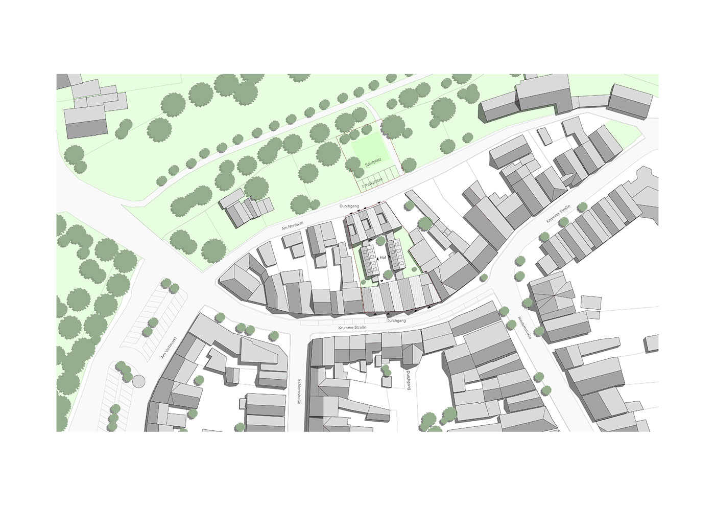 Der Entwurf sieht eine behutsame Weiterentwicklung des erhaltenswerten Bestandes in Kombination mit Neubaumaßnahmen vor. Durch die Wiederherstellung beziehungsweise Beibehaltung der Baufluchten an beiden Straßenzügen und die Aufnahme der das Altstadtbild prägenden Giebeltypologie für die Neubauten wirkt der Baublock wieder als geschlossene Einheit innerhalb des Stadtgewebes. Zur Unterbringung der Wohnungen werden das östliche der beiden Wohnhäuser mit Klinkerfassade zu Einfamilienhäusern umgebaut und das Fachwerkhaus denkmalgerecht saniert. Dazwischen entsteht als Lückenschließung ein dreigeschossiger Neubau mit Putzfassade mit Wohnungen in den Obergeschossen und Gewerbe im Erdgeschoss. Das andere Backsteinhaus wird ebenfalls zum Mehrfamilienhaus umgebaut. Am Nordwall wird der Blockrand mit drei gestalterisch identischen Wohnhäusern mit Wohnungen in den Obergeschossen und KFZ- und Fahrrad-Stellplätzen in den Erdgeschossen geschlossen. Im Blockinneren entstehen zusätzlich 2 Einfamilienhäuser, welche die Remisen-Typologie der Stadthagener Altstadthöfe aufnehmen. Über Durchgänge an der Krummen Straße 34 und im mittleren Gebäude am Nordwall entsteht eine neue blockinterne Durchquerung als Verlängerung der Gerbergasse.