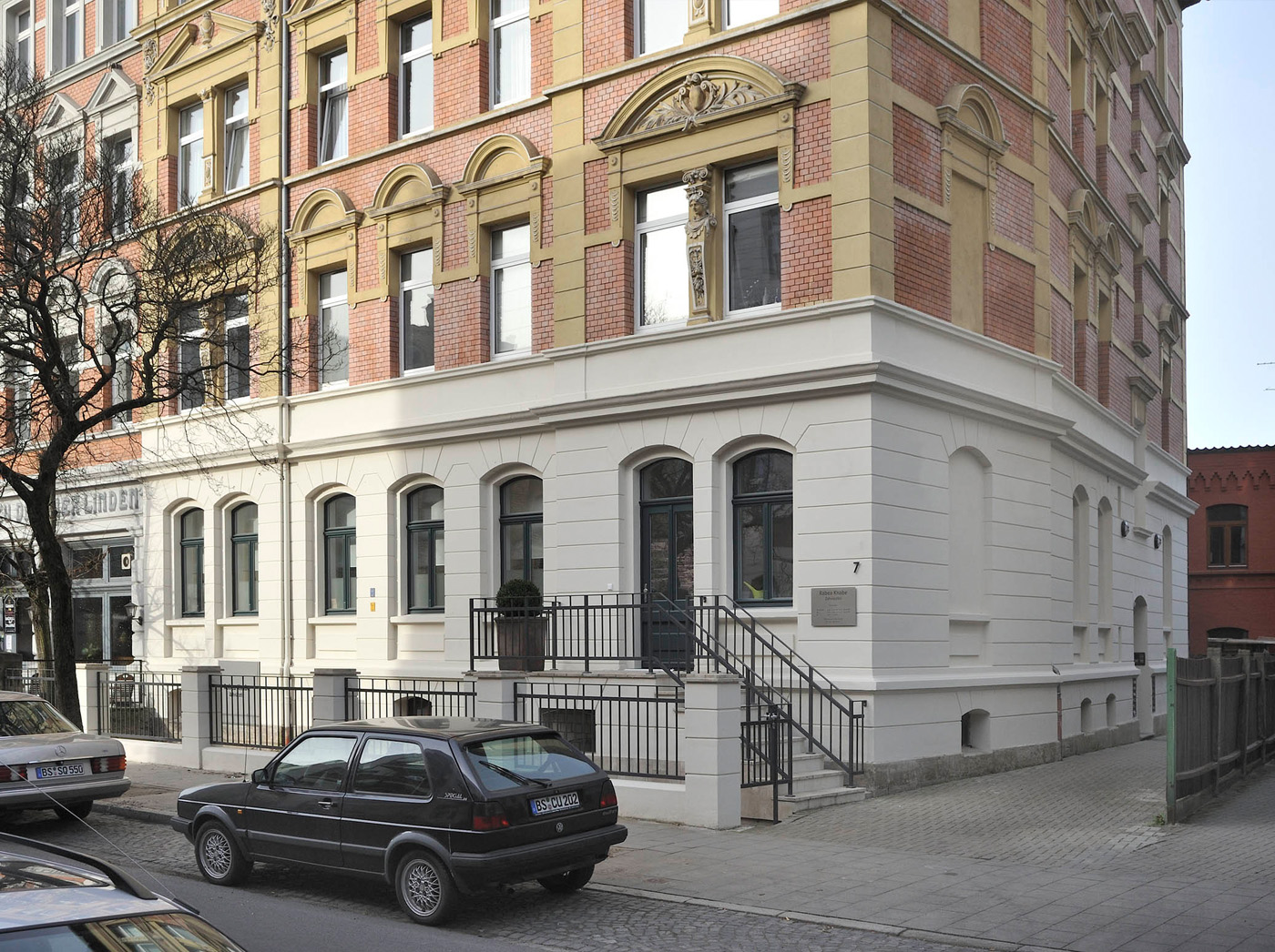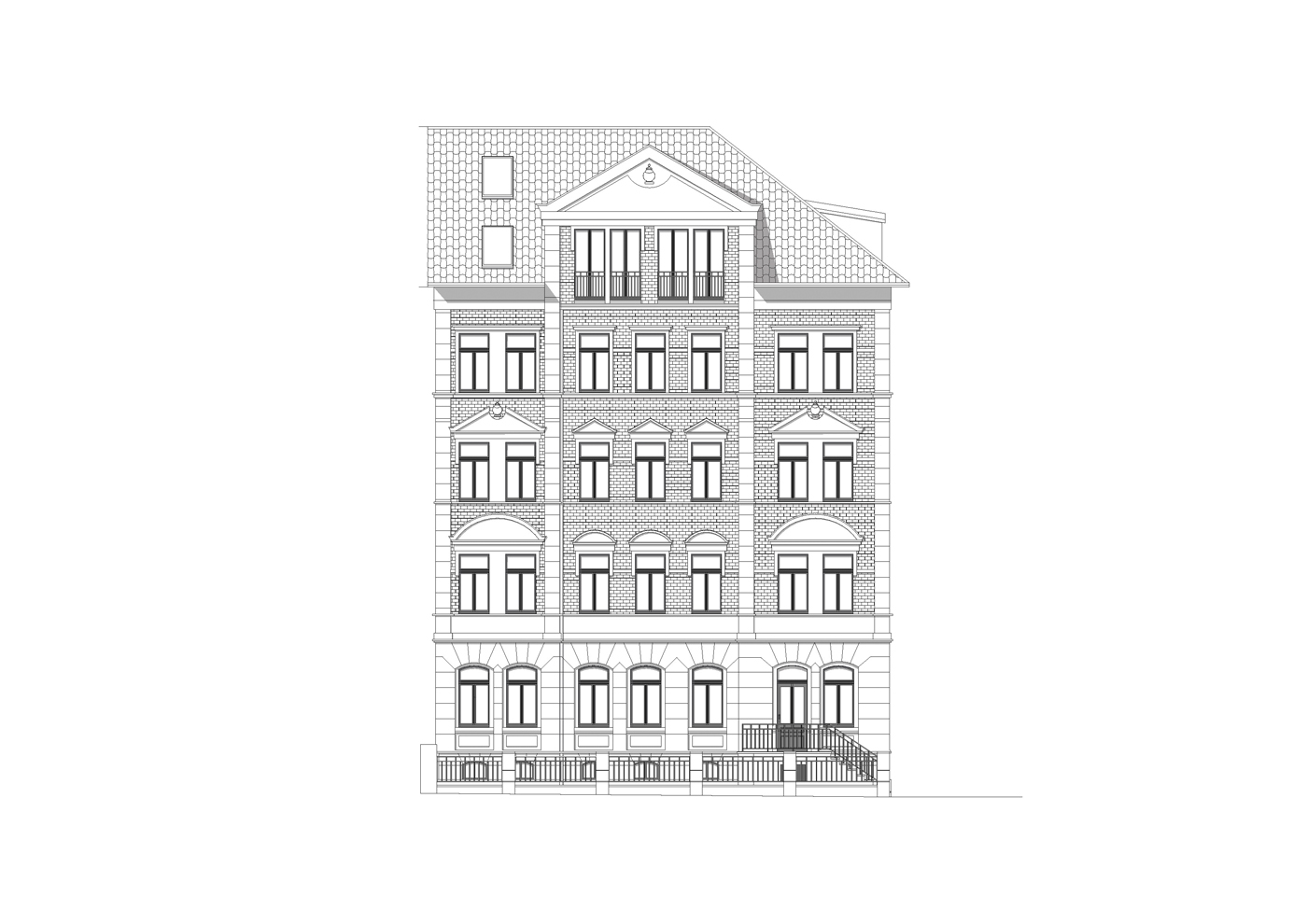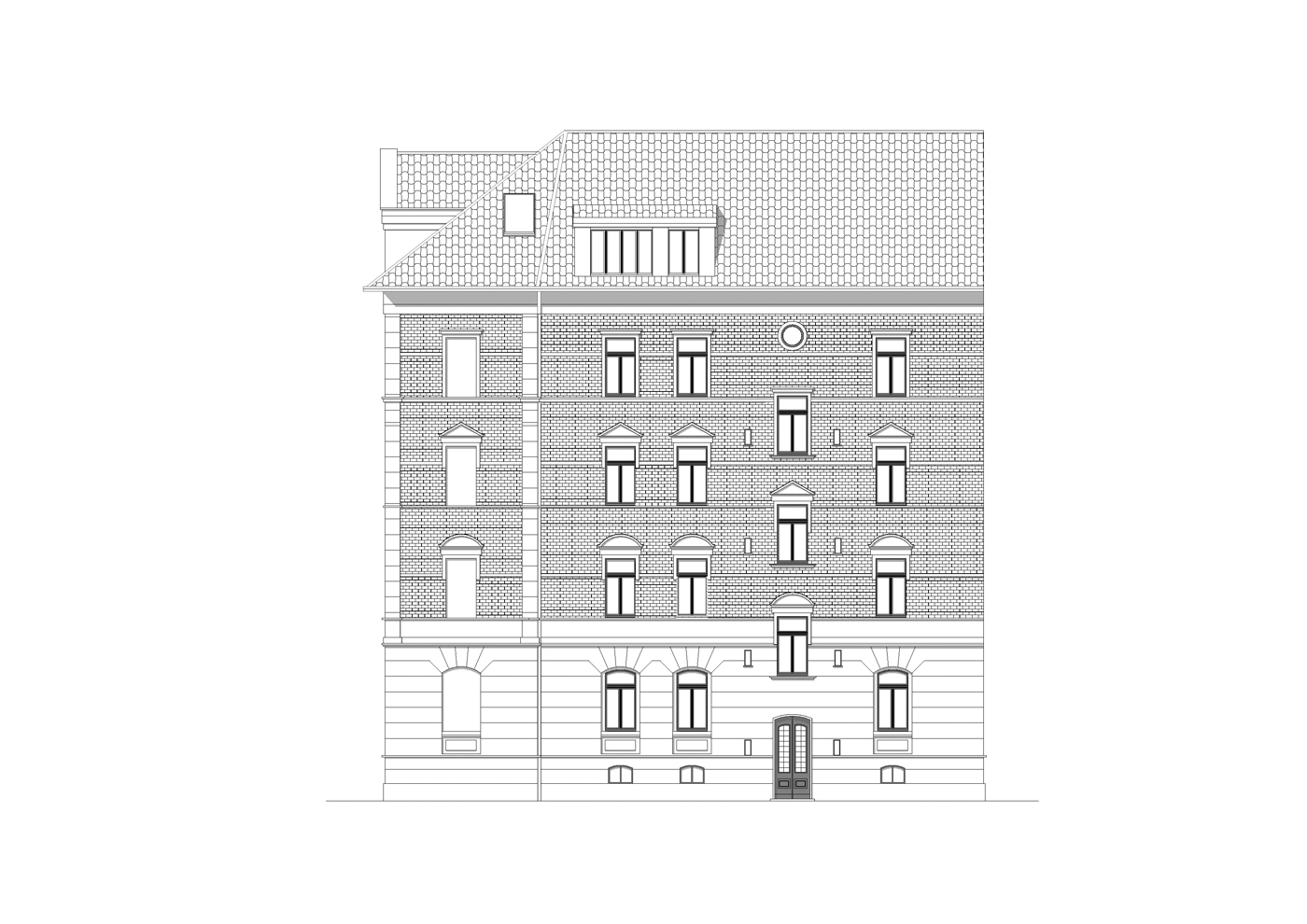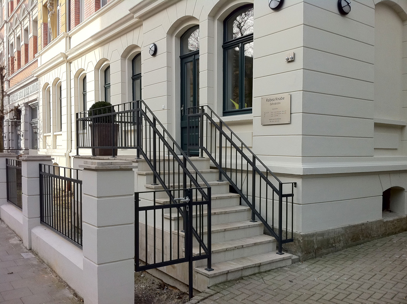 In einem Mehrfamilienhaus aus der Zeit um die Jahrhundertwende wurde das Dachgeschoss zu zwei Wohneinheiten ausgebaut und in einer bestehenden Fensteröffnung des Hochparterres ein zusätzlicher Eingang zu den Räumen einer Zahnarztpraxis wieder hergestellt. Dies entstand in Anlehnung an einen hier früher existierenden Eingang zu einem Frisörsalons. Die neue Eingangsanlage besteht aus einer einläufigen entsprechend der Sockelausbildung massiven Treppe mit Podest und einer Holztüranlage, die sich gestalterisch an den historischen Bestandsfenstern orientiert.